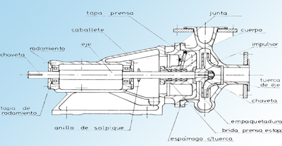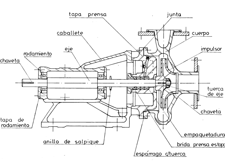 La figura corresponde a una bomba centrifuga tipo back poll out donde la parte rotante se puede retirara por atrás sin desacoplar las bridas de la cañería. Para que esto sea posible, se requiere el empleo de un manchon con distanciador de 4”, 5” o 6” según la longitud del impulsor y el diseño.
